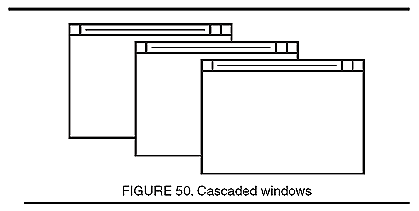 to arrange multiple windows so that they look like a stack of cards, with all but the top and left edges of each window hidden by the one in front of it (see Figure 50). When the windows on a screen are cascaded, you can see the title bar of every window. Contrast tiled windows; overlaid windows.