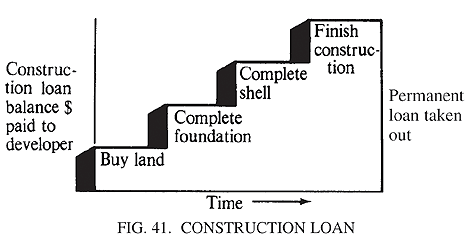 short-term real estate loan to finance building costs. The funds are disbursed as needed or in accordance with a prearranged plan, and the money is repaid on completion of the project, usually from the proceeds of a mortgage loan. The rate is normally higher than prime, and there is usually an origination fee. The effective yield on these loans tends to be high, and the lender has a security interest in the real property.