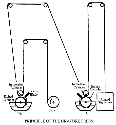 printing process, also called intaglio, where the matter to be duplicated is etched into the printing surface rather than raised from the surface as in letterpress printing. After etching, the incisions are then inked, and as the paper comes into contact with the printing surface, ink is deposited on it in varying amounts, depending on the depth of the incisions. Gravure (photogravure) printing has a soft, velvety quality with subtle gradations of tonal values that combine to produce a lovely illustrative effect, which can even be done on inexpensive paper. (Its reproduction of type, however, tends to be a bit fuzzy.) Gravure printing was used for the first time in an American newspaper in 1914 by the New York Times for its magazine supplement and is used today predominantly for the magazine sections of all newspapers.