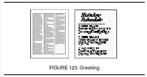 the use of random letters or marks to show the overall appearance of a printed page without showing the actual text.With computers, greeking is used when the page is displayed too small for the text to be readable on the screen.