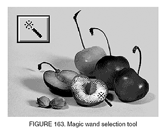 an editing tool that selects an entire area of a particular color, regardless of its shape; magic wands are found in many photo editing programs (Adobe Photoshop, Aldus Photostyler, Corel Photo- Paint).You use the magic wand to select an area for editing. Its power lies in its ability to do a lot of tedious work for you. When you click on a pixel, the magic wand selects an area of that particular color, no matter how jagged the edges.You can then copy, delete, move, rotate, flip, shrink, stretch, or apply filters to this area as if it were a single object.