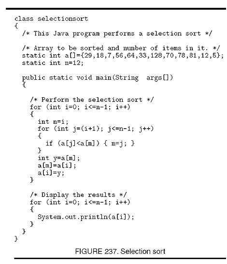 algorithm for sorting the elements of an array by first selecting the lowest-valued item, then the next lowest, and so on. In practice, the lowest-valued item is interchanged with the first item in the part of the array being searched, and the search is confined to the remainder of the array from then on.