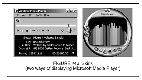 a set of graphics and/or computer code that changes the appearance of a piece of software (Figure 243). For instance, Windows Media Player can be decorated with skins that change its color scheme, window shape, and overall appearance. In games with three-dimensional graphics, skins are also used to personalize the appearance of characters.