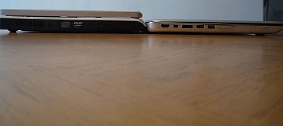 Right away, I noticed how thin the XPS 15z really is. I placed it next to my Dell Inspiron E1505 laptop; as the photo below shows, the entire 15z is slightly thinner than the lower half of my Inspiron. The lid on the 15z alone hardly accounts for any thickness thanks to its ultra-thin 15-inch LED screen. It's just a shame the screen doesn't go all the way to the edge like the MacBook does.
